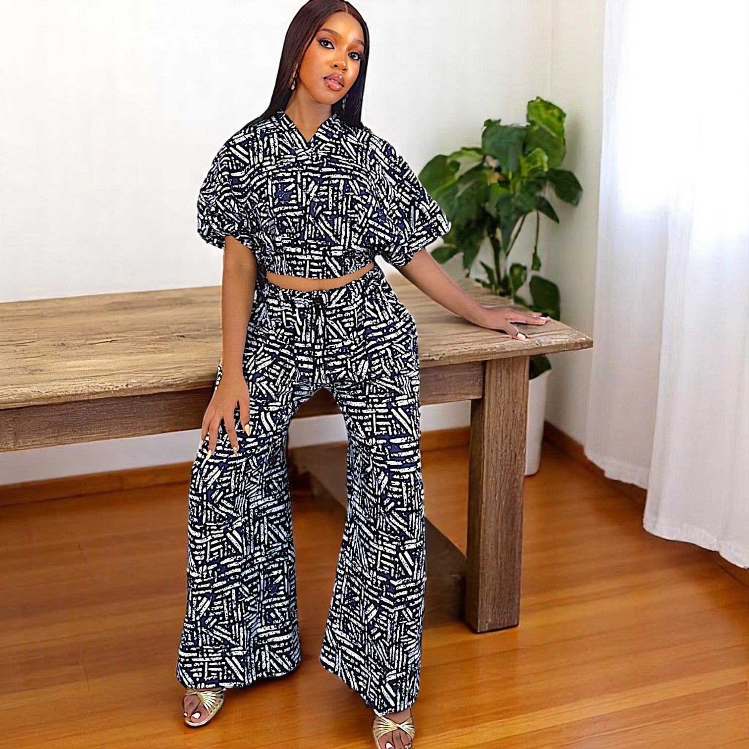 The crop top and long pant are designed to flatter your figure while making a bold fashion statement. Perfect for those who dare to stand out!