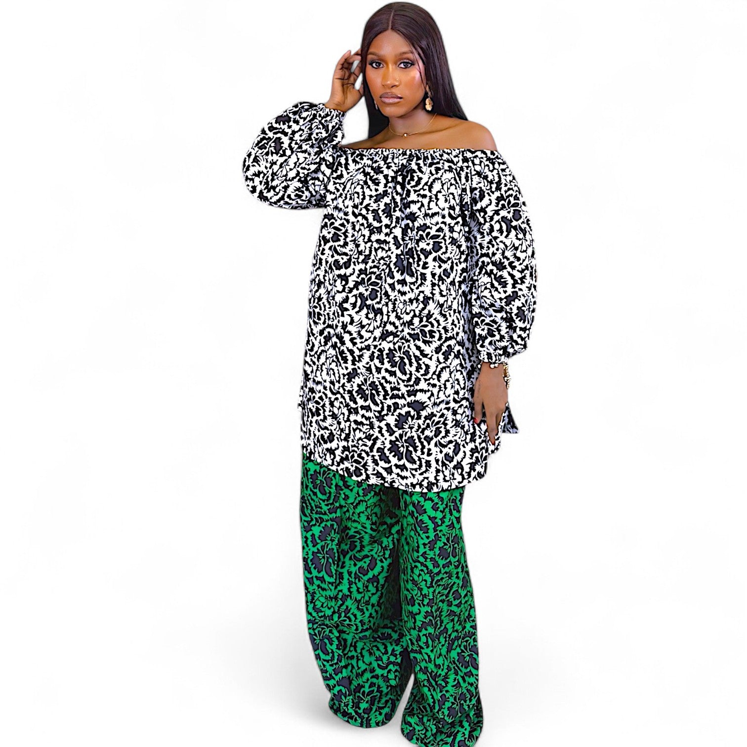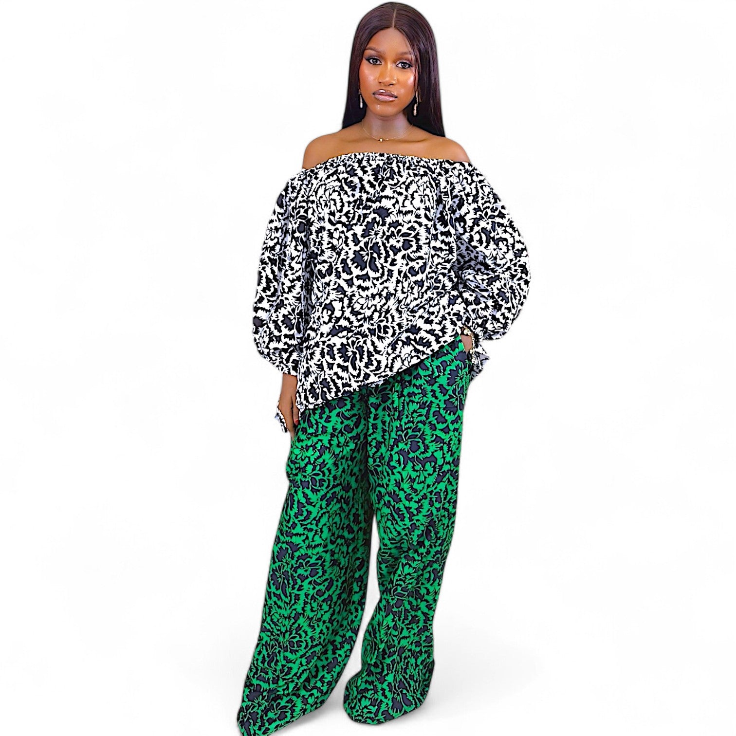 This African print two-piece set isn’t just clothing, it’s wearable resistance. For the bold souls who fuse tradition with tomorrow, this off-shoulder crop top and wide-leg trousers ensemble screams Yoruba heritage meets global runway.