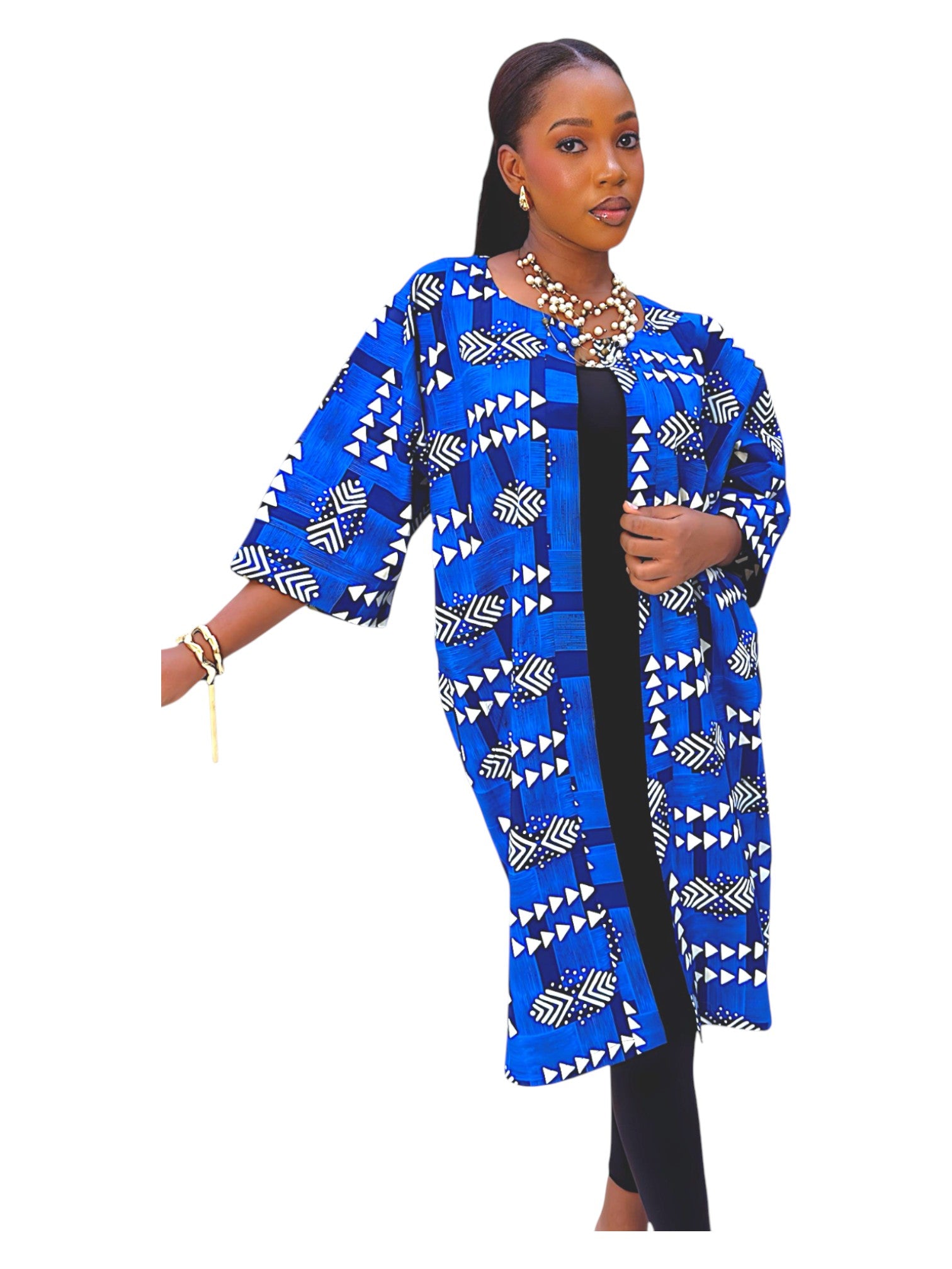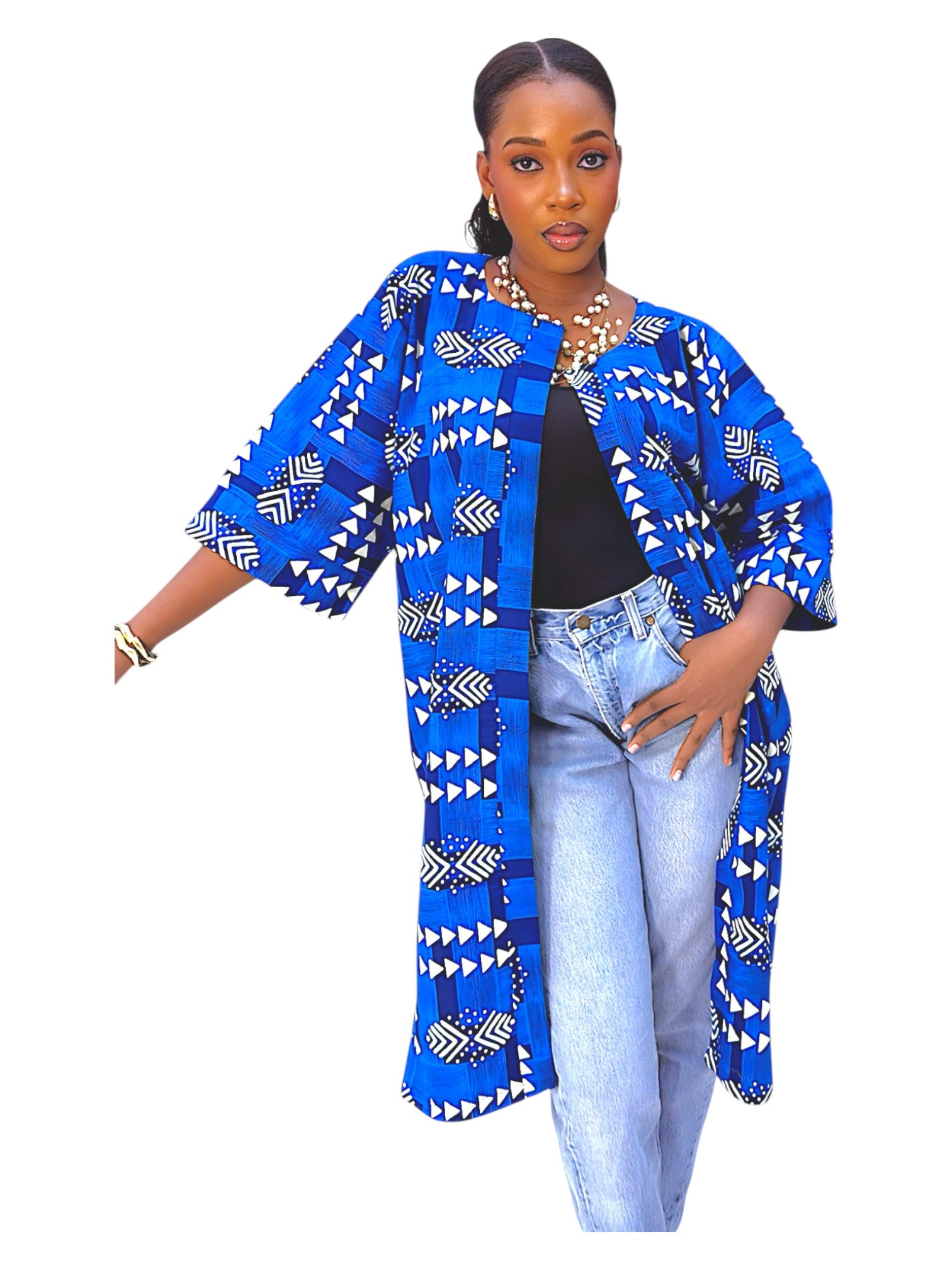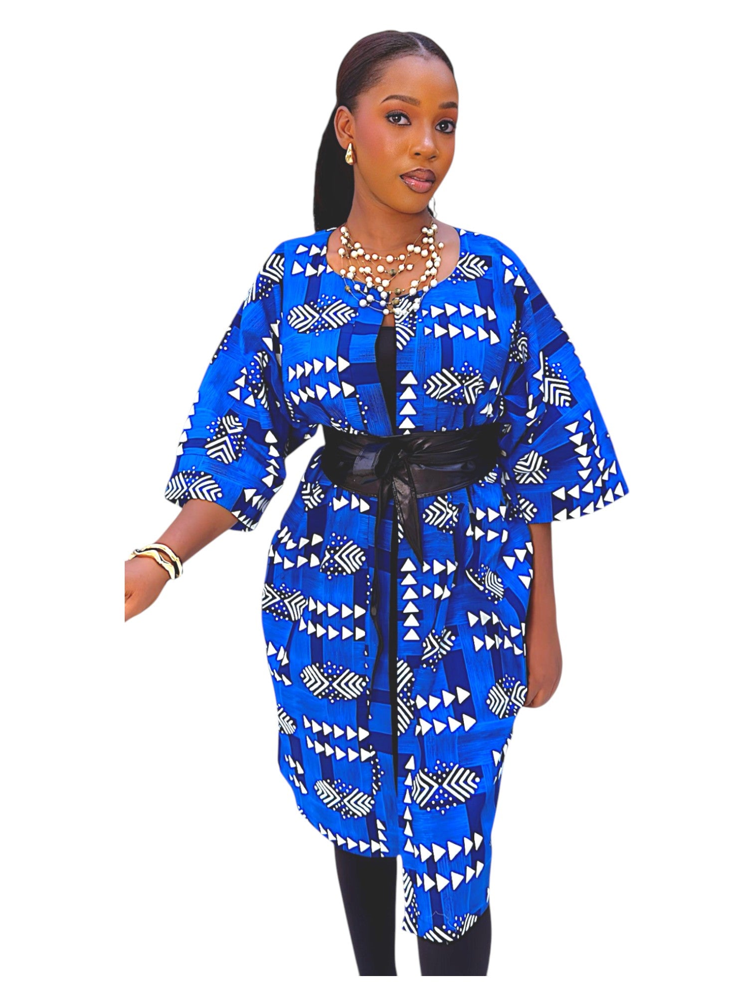 Step into the spotlight with our Eko Lumi - Ankara Kimono Jacket. Made with high-quality Ankara fabric, it features a bold print that's sure to turn heads. The kimono-style jacket is lightweight and comfortable, making it perfect for any occasion.